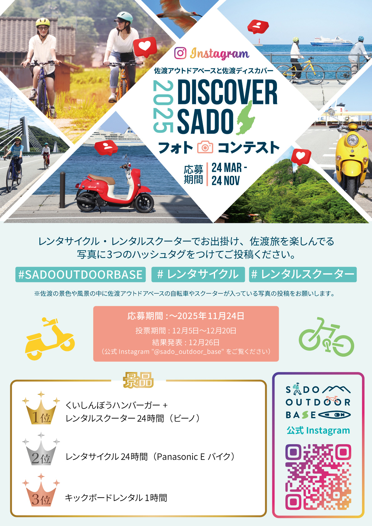 サンフロンティア不動産株式会社(東証プライム8934)の連結子会社であるサンフロンティア佐渡株式会社(本社:新潟県佐渡市、代表取締役社長:堀口 智顕)が運営する新潟県佐渡島の佐渡アウトドアベース(以下、当店)では、「佐渡アウトドアベースと佐渡ディスカバー」をテーマに、Instagramフォトコンテストを開催いたします。