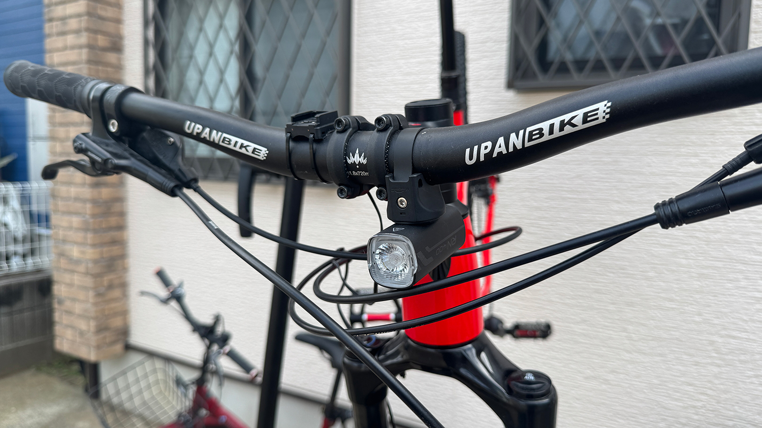 ハンドル上部にスマホホルダーを付ける関係で、ライトと干渉してしまうため位置変更。