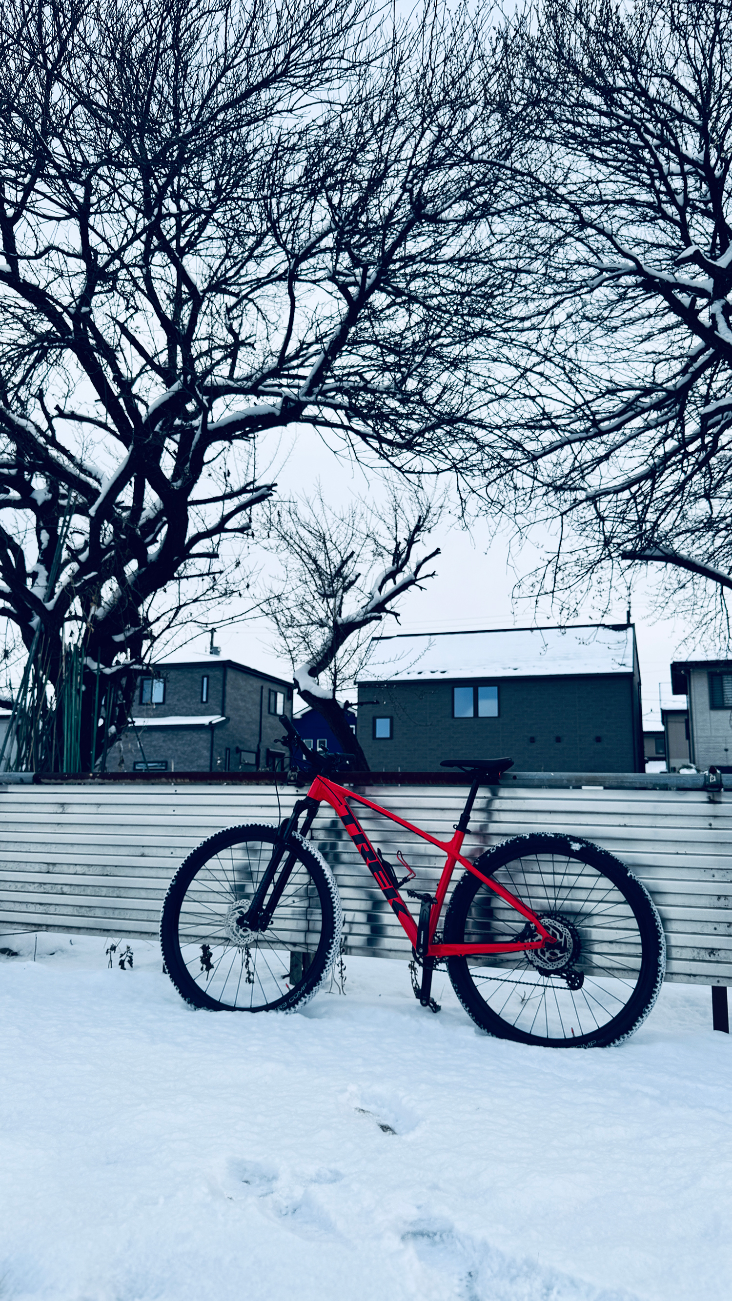 アスファルトの所はすぐ溶けてしまいましたが、近くの林には残っていたので、ちょこっと雪上をライド。